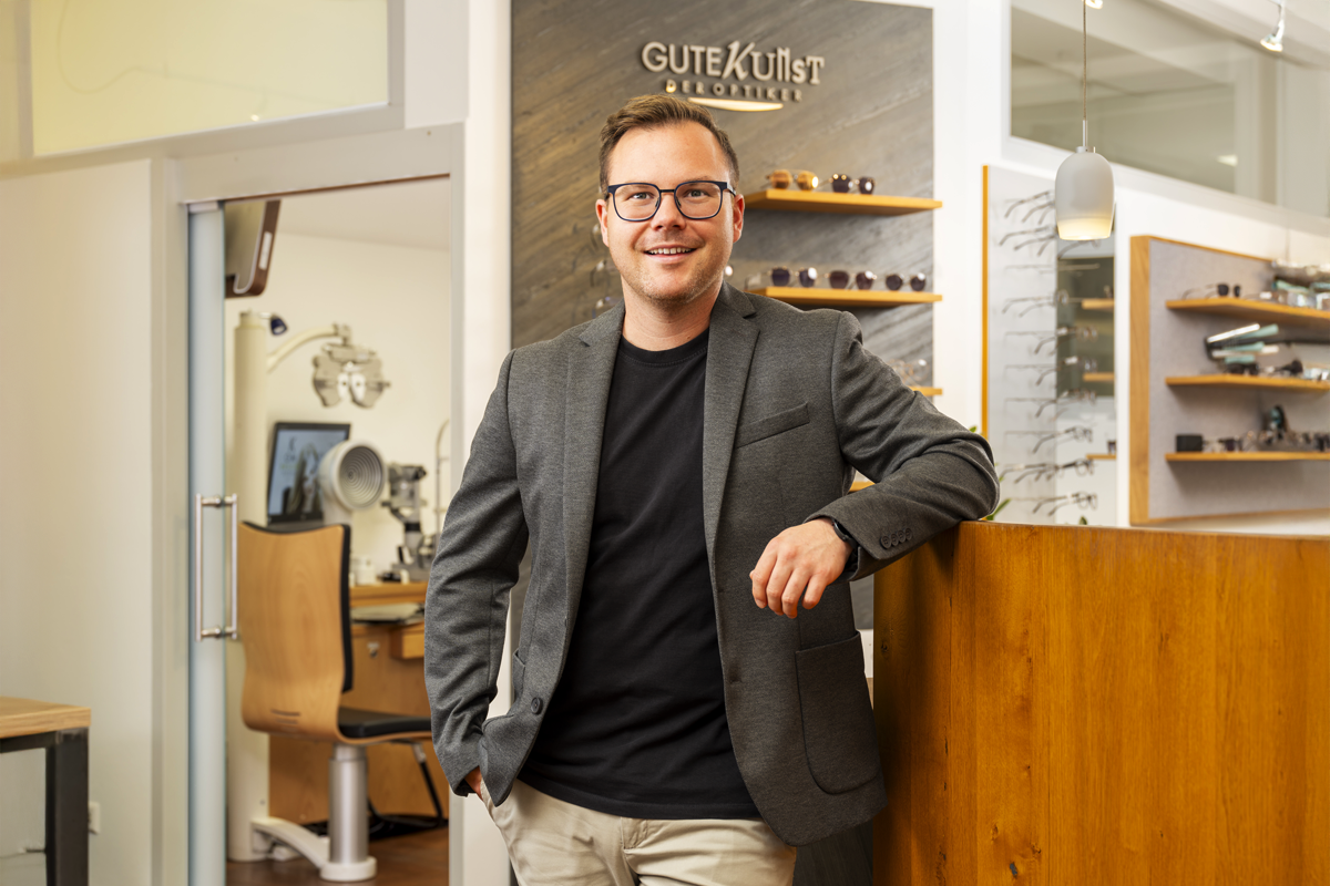 »Ich habe 2007 meine Lehre als Augenoptiker bei der Firma Gutekunst hier in Feuchtwangen begonnen«, erzählt Alexander Bahle. »Aber ich wollte mich weiterentwickeln – also machte ich meinen Meister, wurde staatlich geprüfter Augenoptiker und Optometrist (ZVA). «Die Optometrie – die Bahle als »Erweiterung der klassischen Augenoptik und Erkennung von Sehstörungen« beschreibt – hat die Branche in den letzte Jahren nachhaltig geprägt. Der Beruf des Optikers war früher ein Handwerksberuf, bei dem Brillen feilen und Gläser schleifen zum täglichen Brot gehörten. Das hat sich über die Jahre ins Gesundheitshandwerk gewandelt - so gehören heute Messungen des Augeninnendrucks oder verschiedene Screenings bei einigen Optikern ebenso zum Alltag wie die enge Zusammenarbeit mit Augenärzten.